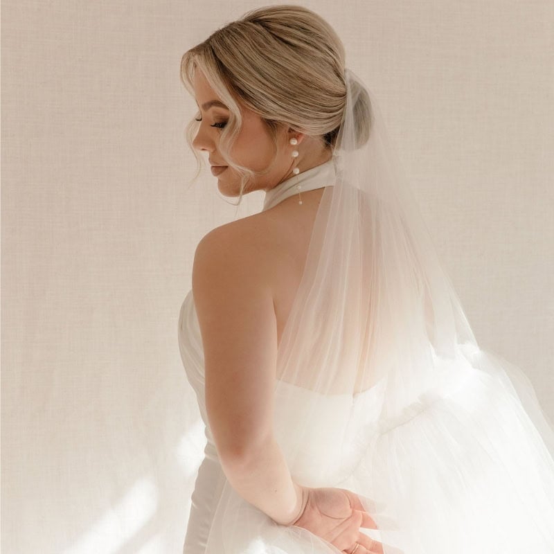 We recommend a flowing dress, ethereal design, such as a chiffon or silk gown with subtle detailing like gentle ruching or a soft, draped neckline with a soft, romantic hairstyle—think loose curls or a half-up, half-down style.