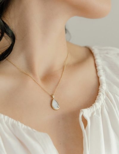 This Mother-of-Pearl Drop Necklace echoes timeless elegance. The teardrop pendant, framed in sterling silver or 9k gold and topped with a 2mm diamond, is a refined choice for those who live for luxury and detail.