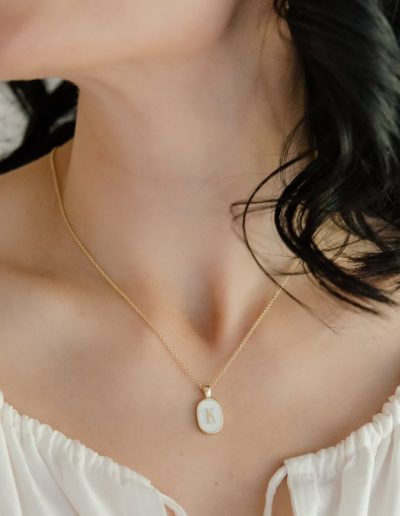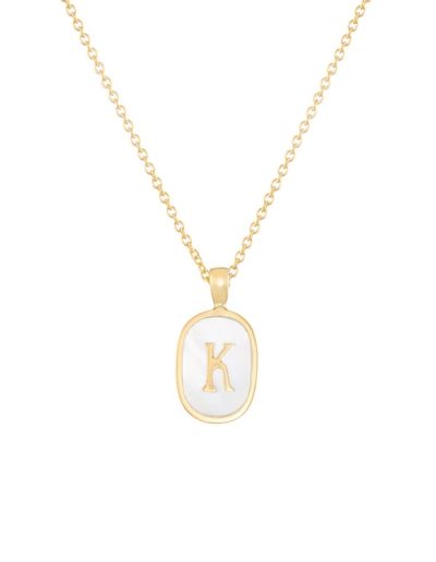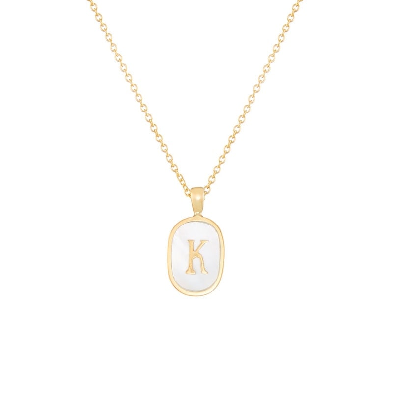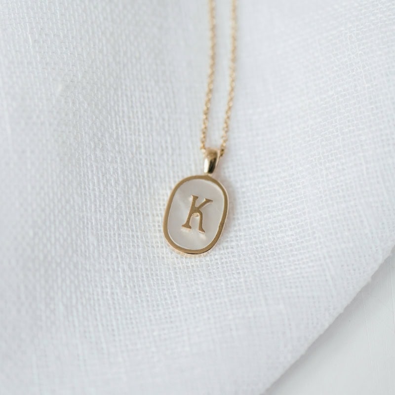 Add a personal touch with the Mother-of-Pearl Oval Initial Necklace. This oval mother-of-pearl pendant, adorned with a custom serif initial and set in sterling silver or 9k gold, is a beautiful personal gift or keepsake.
